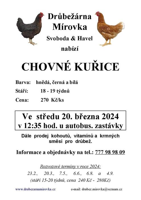 Objednání (doporučujeme) je možné na tel.: 777 98 98 09 nebo drubez.mirovka@seznam.cz.
