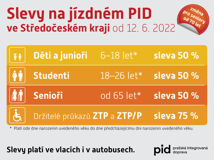 Od 12. června 2022 dochází na základě rozhodnutí Středočeského kraje k několika úpravám jízdného na linkách v systému PID ve Středočeském kraji. Nejvýznamnější změnou je zrušení bezplatné přepravy pro seniory nad 70 let v autobusech a sjednocení podmínek pro tuto věkovou kategorii v autobusech a vlacích PID. Senioři nad 70 let budou nově platit poloviční jízdné, tedy stejně jako nyní senioři od 65 let. Další novinkou je zavedení výhodných krátkodobých i jednodenních jízdních dokladů pro přepravu jízdních kol a speciální zlevněné jízdné bude zavedeno pro účastníky odboje a odporu proti komunismu a válečné veterány.