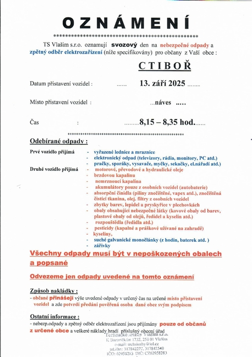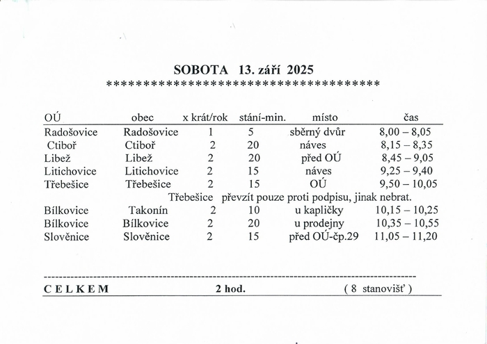 13.9.2025 na návsi od 8.15 - 8.35 hod.