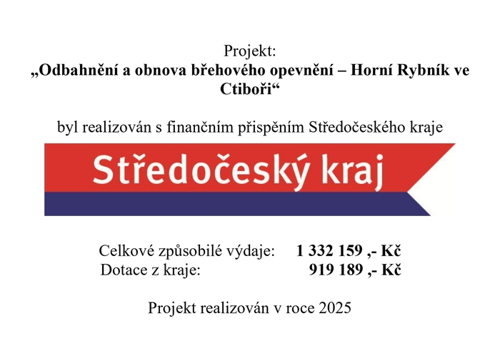 Úvod > Obec > Dotace > Odbahnění a obnova břehového opevnění - Horní rybník ve Ctiboři